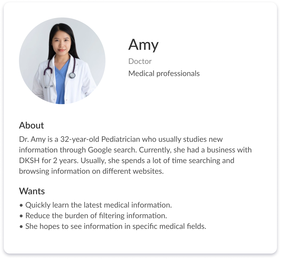 Based on stakeholder interviews with 6 people who worked at DKSH IT/Marketing, we basically divided our website users into 2 groups: Medical professionals and Non-medical professionals, as these 2 types of people behave differently and also have different goals. Both of them are interested in having a digital space to share or access medical knowledge. Also, they would like to have a place make networking easier.